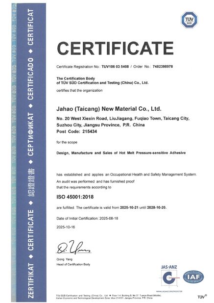 मानक:ISO 45001: 2015 संख्या:TUV100 03 5408 मुद्दा तिथि:2025-10-21 समाप्ति तिथि:2028-10-20